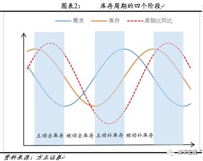 通常来讲,库存周期被划分为被动去库存,主动补库存,被动补库存和主动去库存四个阶段。其中,被动去库存阶段,呈现的是经济复苏,需求开始好转,而企业由于在上一周期中的库存挤压,仍然处于去库存之中,库销比下降;随着需求持续好转,企业开始补库存,库销比维持底位,经济进入主动补库存阶段;当需求拐点出现后,企业仍在补库存,库销比上升,进入被动补库存阶段;伴随需求的持续回落,企业主动减少库存,库销比维持高位,进入主动去库存阶段。
