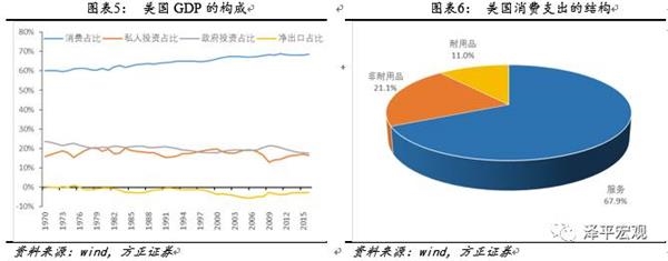 美国是一个典型的消费国,终端消费是拉动美国GDP增长的基础和核心动力。从2016年美国GDP的结构来看,其中消费占GDP比重为68.7%,为美国经济增长提供主要动力。私人投资占比16.3%,政府投资占比17.7%,净出口占比为-2.7%。而从其消费的结构来看,服务消费贡献最大,占比为67.9%,耐用品和非耐用品占比分别为11.0%和21.1%。