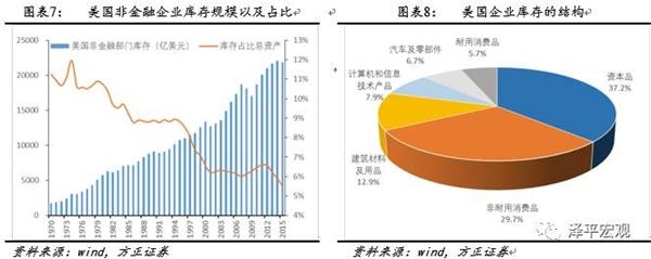 从美国企业库存来看,依据美国经济分析局数据显示,当前(2015年)美国非金融企业库存规模为21835亿美元,在其非金融企业资产负债表中的占比为5.5%,而从美国企业库存的结构来看,资本品库存所占比例最大,为37.2%,其次是非耐用消费品,库存占比为29.7%,建筑材料及用品、计算机和信息技术产品以及汽车及零部件的库存占比分别为12.9%,7.9%和6.7%,耐用品占比最小,为5.7%。