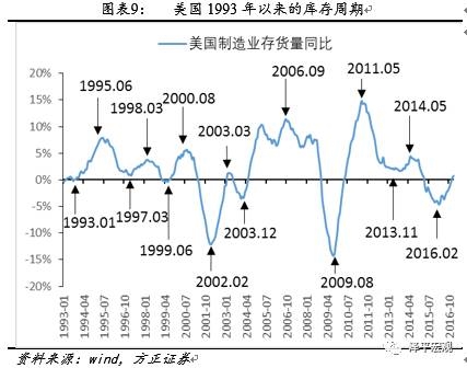 以美国制造业存货量的同比作为判断美国库存周期的指标,存货量同比上升则为补库存,存货同比下降则为去库存。研究发现,1993年以来美国经济经历了1993-1997、1997-1999、1999-2002、2002-2003、2003-2009、2009-2013、2013-2016七轮库存周期,平均每轮周期长度为40个月。目前美国处于第八轮周期上升期,由被动去库存转为主动补库存。