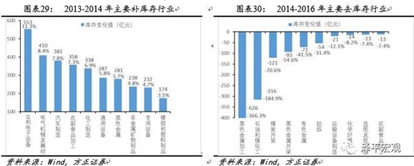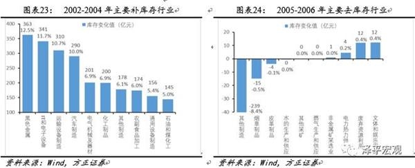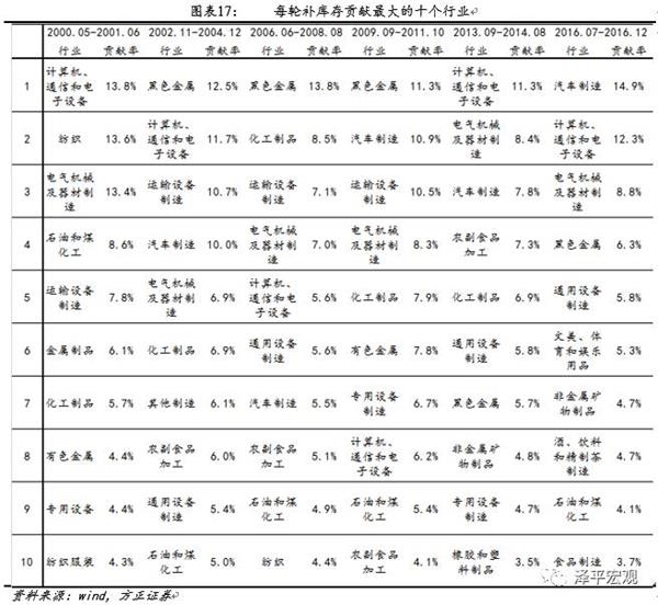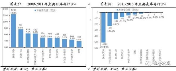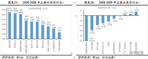具体来看中国历次库存周期调整的行业驱动因素各有不同,2000年补库存动力主要来自中游和下游行业(包括纺织、计算机通信及机械行业等);2001年去库存动力来自汽车及运输制造业。2002年补库存过程主要由中上游行业(包括黑色金属、运输制造业、汽车制造、电气设备和化工等)推动;2004年去库存主因是黑色金属冶炼、电器机械及化工行业去库存。2006年补库存动力主要来自偏上游的黑色金属冶炼、化工行业等行业;2008年去库存动力主要来自通用设备制造、专用设备制造及非金属制品行业。2009年补库存动因主要是上中游的黑色金属、有色金属,汽车及运输制造业库存扩张,2011年去库存动因主要是黑色金属、橡胶塑料、文体娱乐、化工及农副产品行业库存收缩。2013年补库存过程由下游的计算机通信、汽车及农副产品行业驱动,2014年去库存动力来自计算机通信、医药及汽车行业。