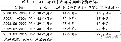 中国自2000年以来共经历了2000年至2002年、2002年至2006年、2006年至2009年、2009年至2013年及2013年至2016年五轮库存周期。从时间跨度来看,2002年至2006年、2006年至2009年及2009年至2013年三轮周期时间较长,持续平均40个月以上。这三轮长库存周期过程均伴随较长时间的补库存过程。