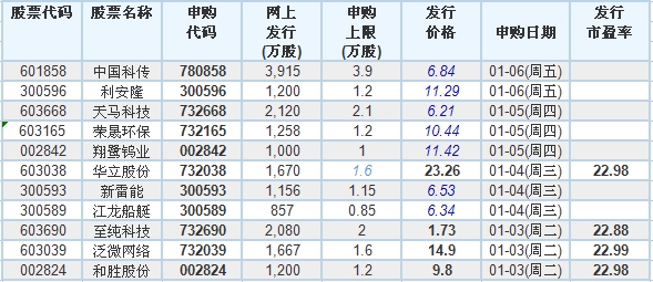 2017年1月3日至1月6日,沪深两市将有11只新股发行。他们依次是:1月3日发行的是至纯科技、泛微网络、和胜股份;1月4日发行的是华立股份、新雷能、江龙船艇;1月5日发行的是天马科技、荣晟环保、翔鹭钨业;1月6日发行的是中国科传、利安隆。其中,沪市六只,深市中小板2只、创业板3只。