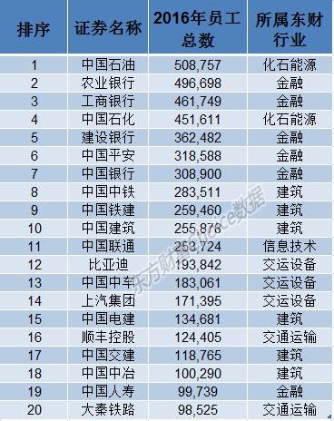 根据东方财富Choice数据统计,在A股公司中,员工数量最多的公司为中国石油,该公司2016年的员工总数达到了50.87万人,人数之多堪比拉萨的常住人口(约为56万人).