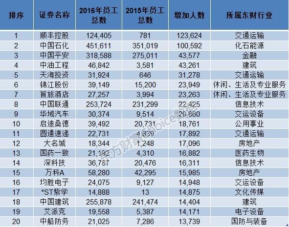 顺丰控股则是2016年员工人数增加最多的A股公司。该公司2015年的员工人数为781人,而在2016年短短一年的时间里,突然增加了12.36万人,主因是公司完成重组。同为快递行业的圆通速递去年的员工人数也大幅增加了1.79万人。