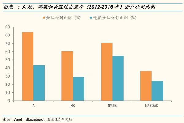 相比海外成熟市场,A股现金分红公司数量比例较高。数据上来看,过去五年(2012-2016年)A股上市公司中进行过现金分红的公司数量占比为83.6%,高于港股的60.4%和美股的51.32%(纽交所为70.5%,纳斯达克为36.1%)。并且,A股上市公司中连续5年每年都进行现金分红的公司数量占比也高达43.3%,仅次于纽交所的70.5%。