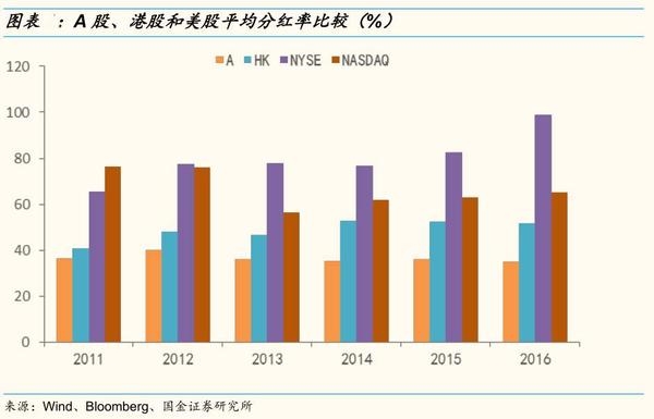 (1)A股现金分红公司比例较高:过去五年,A股上市公司中进行过现金分红的公司数量占比为83.6%,高于港股的60.4%和美股的51.3%。(2)A股股息率明显较低: 2016年A股股息率(TTM)为0.51%,明显低于港股的2.02%和美股的1.85%。(3)A股上市公司平均分红率较低:2016年A股平均分红率为35%,而同期港股和美股平均分红率分别为51.6%、82.0%。