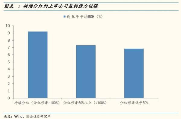1)持续分红的上市公司一般都有较强的盈利能力。我们发现持续分红的上市公司近五年平均ROE为9.2%,高于分红频率较低的公司;2)利润增速来看,持续分红上市公司的近五年归属母净利润累计增速为113.6%,低于分红频率较低的上市公司。