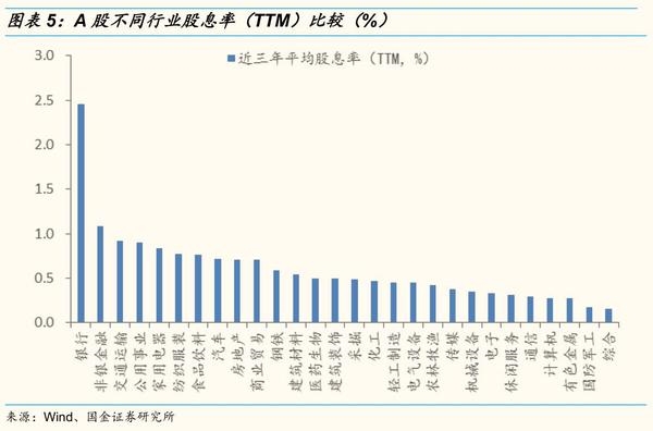 近三年来(2015-2017年)A股银行行业平均股息率达2.46%,非银金融(特别是保险股)为1.09%。第二阶梯,股息率较高的分别为交通运输(主要集中在铁路、公路、机场等)0.92%,公用事业(主要集中在电力)0.90%,家电0.84%,纺织服装0.77%,食品饮料0.76%,汽车0.71%,房地产0.70%,商业贸易0.70%。