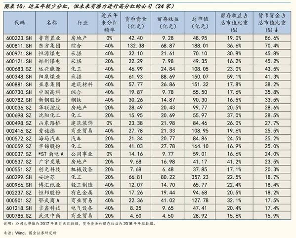 企业现金分红来自于企业当期利润和留存收益,所以我们用企业货币资金占总市值比重和留存收益占总市值比重来刻画企业进行现金分红的潜力。我们筛选出了近五年较少分红(分红频率低于50%),但未来有潜力进行高分红的公司(留存收益占总市值比重和货币资金占总市值比重都排在所有上市公司中前20%的公司).