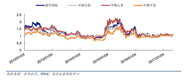 招商证券认为,按照保险股目前的股价和内含价值之比(P/EV),四大上市险企目前这一数据已降至0.9倍左右,和2012年初下降幅度达到45%,处于5年来的低位,保险股价值被严重低估。预计2017年随着保费规模整体趋势上行、投资端趋于稳定以及四季度准备金拐点出现等预期的叠加,保险股板块估值将企稳回升。