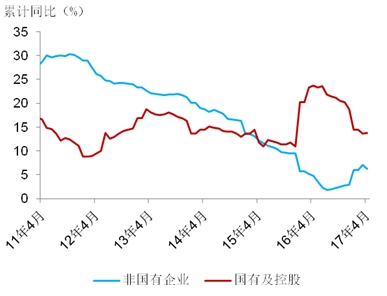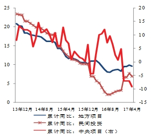 铁路运输业和水利管理业投资回落较明显,中央项目投资-9.2%,地方项目投资回落至9.6%(图10和图11).基建投资呈现较明显的外生性,与财政支出节奏相关。今年一季度财政支出占全年预算支出的比为23.6%,明显快于过往五年(2012-2016年每年占比位于19-20%区间).4月份,财政支出节奏有所控制,1-4月累计占比30.6%,但仍高于往年(2012-2016年1-4月累计支出占全年比在26-27%区间).
