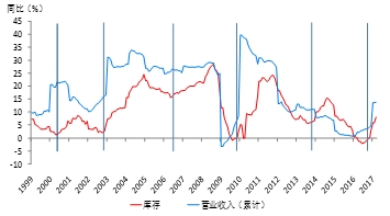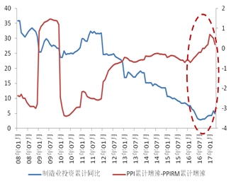 PPI-PPIRM(工业品购进价格指数)的差一定程度上反映工业企业“收入-成本”,其领先于工业企业利润增速的变动。2012年三季度工业企业盈利增速见底,而PPI-PPIRM则于2011年四季度率先见底。2015年12月以来的上游价格回升中,PPI增速高于PPIRM。自2016年11月份,PPI与PPIRM增速差转负,且负差不断扩大,盈利增速趋缓影响制造业投资放缓。