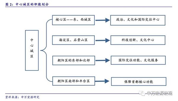 中央政务区呼之欲出。中心城区划出四个功能分区:核心区、西北部地区、东北部地区和南部地区。“核心区”主要指东城区和西城区,是政治中心、文化中心和国际交往中心的核心承载区。如果按照这样的划分去理解,东城区和西城区已经具有事实上的中央政务区的概念;两区面积共有92.54平方公里,2015年常住人口为220万人,地区生产总值合计5128亿元。“西北部地区”主要指海淀区、石景山区,以科技创新、文化中心为主导功能。朝阳区的东部和北部被划分为“东北部地区”,着眼于国际交往功能和公共文化服务。朝阳区南部和丰台区一起被划分为“南部地区”,以保障首都核心功能的城市服务为主导功能。
