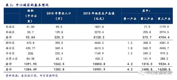 而从中心城区的基本情况来看,担负政治中心职能的东城区和西城区的面积共有92.54平方公里,2015年的常住人口为220万人,地区生产总值合计5128亿元。
