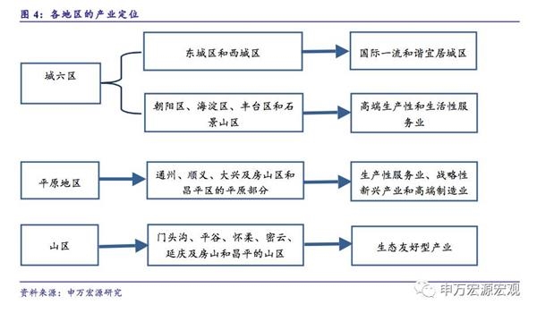 各地区的产业定位。东城区和西城区着力建设国际一流和谐宜居城区。朝阳区、海淀区、丰台区和石景山区则主要发展高端生产性服务业和生活性服务业。城六区以外的平原地区,主要承接和集聚国际交往、文化创意、科技创新等高端资源,重点发展生产性服务业、战略性新兴产业和高端制造业。山区的主要功能是生态保障和水源涵养。主要是提升旅游休闲等服务功能,建立生态友好型产业体系。