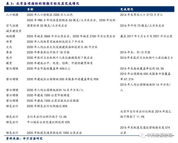 新北京带来的投资机会。1、生态环保。建设国际一流和谐宜居之都的目标将带来生态环保领域的投资机会。草案提出,2020年PM2.5年均浓度控制在56微克/立方米左右,2030年达到国家标准35微克/立方米左右;而2016年为平均73微克/立方米左右。因此,北京及京津冀地区的环保治理力度将会显著加强。2、基建交运。城市布局的大幅度调整以及产业的搬迁转移,必然会带来城市基建需求的大幅提升。以轨交为例,2020年轨道交通里程要达到1000公里左右,而2016年末轨道交通运营线路长度为574公里,相当于具有74%的增长空间。3、地产。随着城市布局的进一步优化,重点区域的地产存在显著的升值空间。按照区域的重要性及受益空间来看,中心城区的东城区和西城区、城市副中心及其周边的通州区和北三县受益较大。