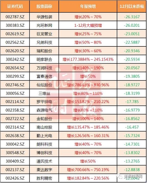 综合上述条件,我们整理了12月以来股价严重超跌,且年报预增的中小盘个股,供投资者参考。