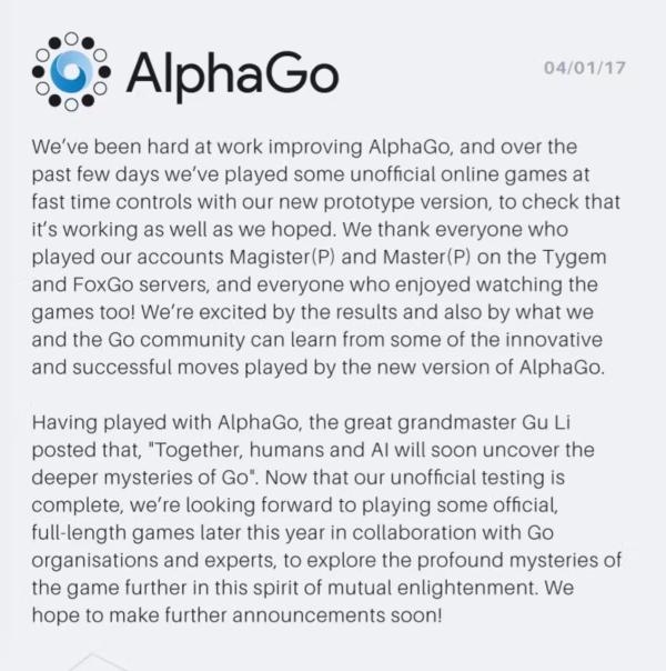 “我们需要感谢所有与我们的Magister(P) 和Master(P) 账户在弈城围棋网以及野狐围棋网对弈的棋手,也要感谢所有观战的人!最新的阿尔法围棋在对局中所富有启发性的创新,我们从中可以学到的,以及对局的结果都令我们非常激动。”