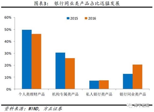 2、从理财的存续情况来看,2016年高增但放缓,同业占比迅猛增加至20.61%,较2015年上升7.84个百分点。