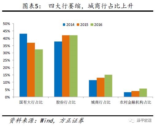 3、从理财的发行方来看,五大行占比萎缩,股份行、城商行和农村金融机构增加迅猛。