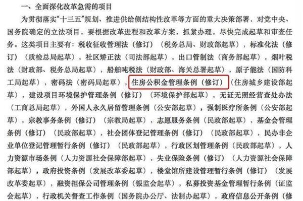 在国务院发布的《国务院2017年立法工作计划》中,修订住房公积金管理条例被纳入全面深化改革急需的项目,由住房城乡建设部起草。