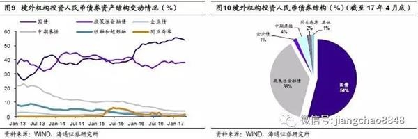 当前境外机构在我国的债券持仓中90%以上为利率债。从债券市场托管量数据来看,截至17年4月底,境外投资者债券持仓中国债占比达到了54%,政金债占比38%,两者占比合计超过90%。从动态变化来看,16年以来境外机构投资者增加了对国债的配置比例,同时小幅减少了对政金债的配置比例,但两者占比之和从16年初的82%上升到目前的92%.