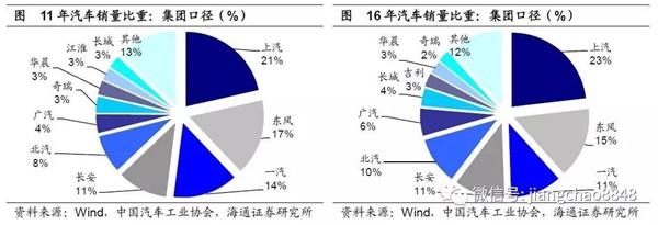 汽车行业龙头优势显著。我们采用厂家销量数据,考察汽车行业制造业集中度。根据中国汽车工业协会数据,16年上汽集团汽车销量647万辆,占全行业的23%,是第二名东风集团(428万辆)的1.5倍,前两家销量占比接近40%,而第三至五名销量均在300万辆左右。事实上,过去5年间,上汽、东风、一汽、长安、北汽、广汽包揽了销量前6名,6家合计占比从11年的75.1%提升至16年的76.4%。此外,华晨、长城、江淮、奇瑞、吉利也都是销量前十名的常客。整体而言,汽车行业排名较为稳定。