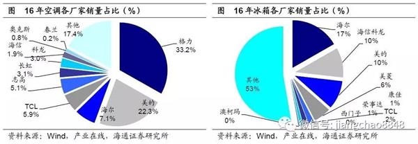 空调两强独霸,冰洗相对分散。根据产业在线数据,16年格力、美的空调销量占比分别为33%和22%,合计已超过50%。而前十家销量占比83%,行业集中度整体较高。相比之下,同为白电的冰箱、洗衣机销量则较为分散,龙头优势不如空调行业。16年冰箱销量前三强分别为海尔(16.7%)、海信科龙(10.2%)和美的(9.8%),但前9家销量占比仅47.3%。海尔(20.1%)、美的(19.5%)领跑16年洗衣机销量,但前7家销量占比仅43.5%。黑电中的LCD电视与冰箱、洗衣机类似,虽然TCL14.2%、海信12.5%、创维11.6%占比较高,但前6家销量占比也仅50.3%.