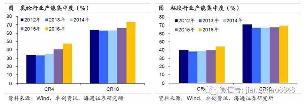 化工子行业庞杂,子行业内又有大量非上市公司,较难从产量、销量维度衡量行业集中度,因而我们同样从产能维度衡量行业集中度。以下我们以氨纶、粘胶两个子行业为例,这两个行业过去几年集中度都有所回升,但幅度略有不同。