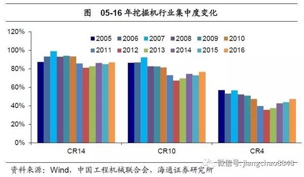 工程机械行业中最具代表性的是挖掘机制造业,该行业规模从01年的14家扩张至16年的30家,销售数据较为完备,因而我们从销量维度衡量挖掘机行业集中度情况。
