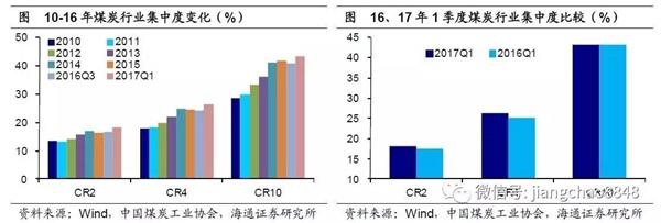 集中度小幅震荡,16年回落17年反弹。10-14年间,中国煤炭行业集中度(CR2、CR4和CR10)呈稳步回升态势。但15年CR2、CR4均略有回落,而CR10仍继续上升。16年前11个月行业集中度走势略有分化,CR2较15年略升,但CR4、CR10均回落。但17年1季度行业集中度则较16年前三季度显著回升并创下历史新高。考虑到季节性因素的影响,我们比较16、17年1季度煤炭行业集中度,发现CR2、CR4、CR10也都较去年同期上升。