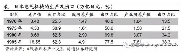 工程机械、电气机械行业是从进口替代升级至出口拓展的典范。日本电气机械行业总产值由70年的3.4万亿日元激增至85年的18.6万亿日元,年均增幅12%,而出口占总产值比重则由70年的25.5%升至85年的52.3%,增加了整整一倍。其中产业用电气机械的出口占比更是从70年的13.5%上升至85年的38.3%,民用电气机械的出口占比更是高达77.5%.