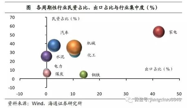 下图中,我们总结了各周期性行业外需占比(X轴)、民资占比(Y轴)与当前行业集中度(气泡大小)的关系。行业未来的集中度将在当期基础上演进,而外需占比越高、民资占比越高,都将有利于行业集中度的进一步提升。
