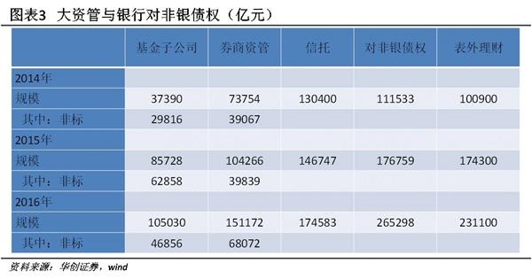借道大资管的新增信贷投放约12万亿。对非银债权的高增是银行资产与社融背离的另一个源头。刚性兑付下,为规避监管,银行借道非银实现对融资平台、地产和产能过剩行业的信贷投放,在金融资产负债表上就表现为对非银债权的膨胀。截止2016年12月,对非银债权余额26.53万亿,较14年新增15.38万亿,此外表外理财新增13万亿;同期大资管(基金子公司、券商资管和信托)新增19.39万亿,其中非标新增约12万亿。