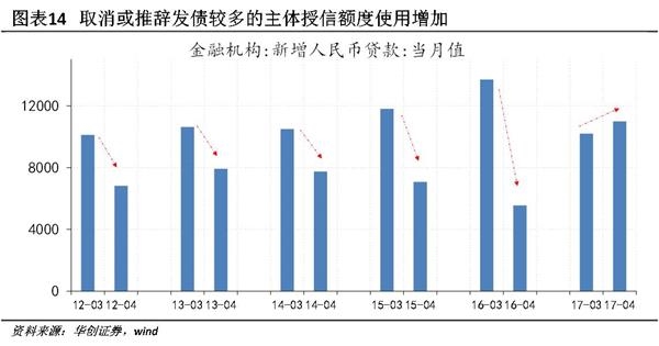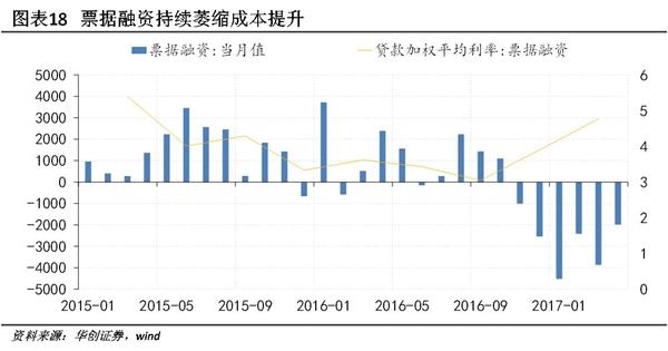 实体融资视角:融资成本回升、表外融资收缩。2017年年初以来,10年期国债收益率上行52BP,由于利率过高而取消或推迟发债的规模高达3050亿,信托、委托贷款在一季度的狂欢过后也在4月急剧收缩;表内信贷方面,一季度票据融资加权平均利率上行87BP,一般贷款仅上行19BP,但随着资金成本的不断上扬,预计在二季度也将加速上行,微观调研显示多家银行正在上调FTP价格。