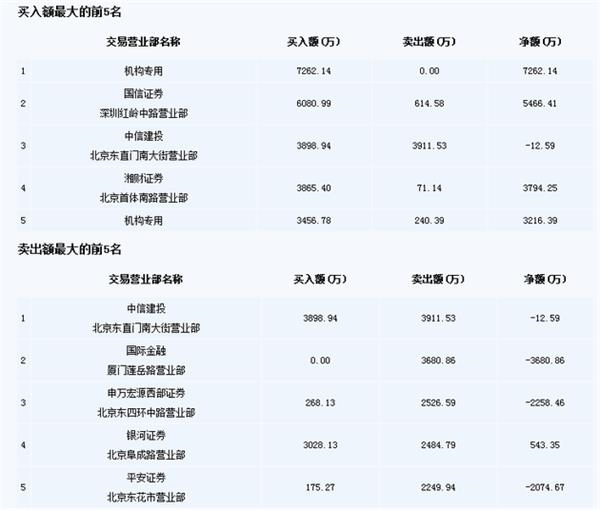 盘后龙虎榜数据显示,有两家机构席位今天大幅买入,分别净买入7262万元和3216万元,净卖出最多的是中国国际金融股份有限公司厦门莲岳路证券营业部,净卖出额为3680.86万元。值得注意的是,卖三、卖四、卖五都是北京的营业部。