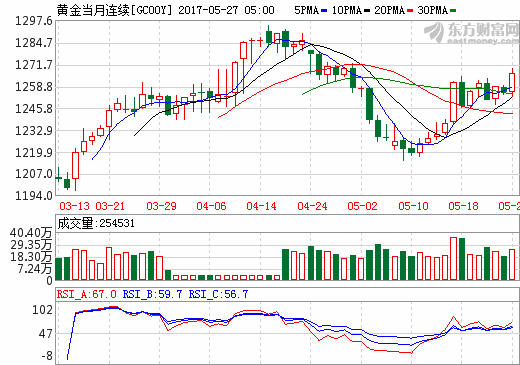 截至收盘,COMEX 6月黄金期货涨11.70美元,涨幅0.9%,报1268.10美元/盎司,本周累涨1.2%,连续第三周上涨。
