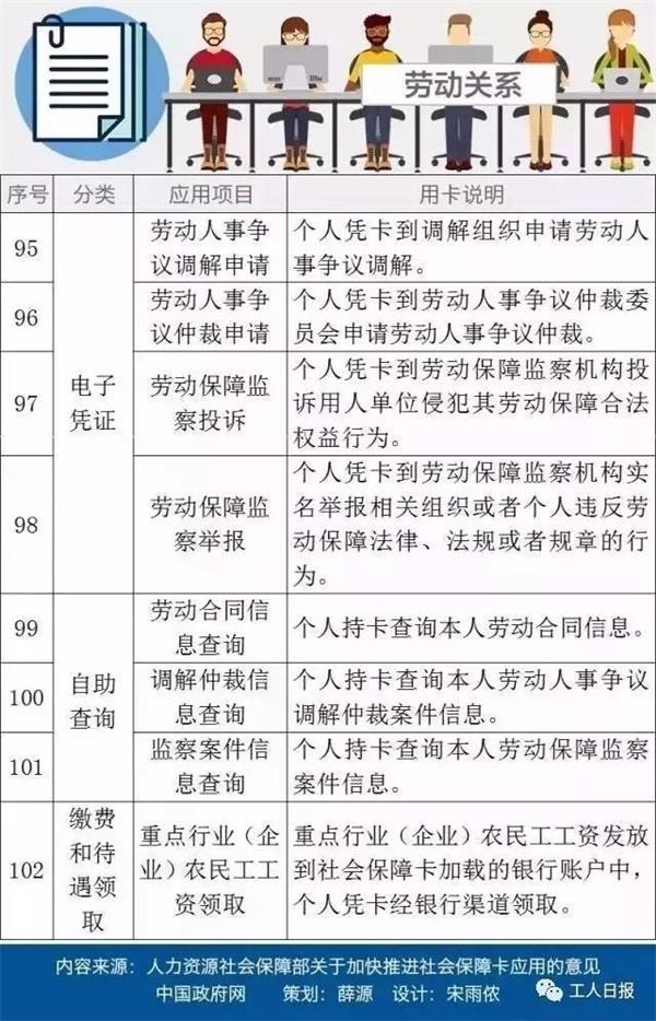 (一)电子凭证功能。将社会保障卡作为持卡人办理就业登记、失业登记、参保登记、工伤认定、职业培训、技能鉴定等人力资源和社会保障业务,享受各项就业扶持政策和就业服务、社保服务、人才服务的主要电子身份凭证。