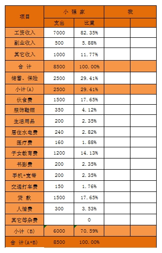 下图是小强家的收支和存储情况表,你可以对照看看,自己的钱都花哪里存下多少?单位(元)