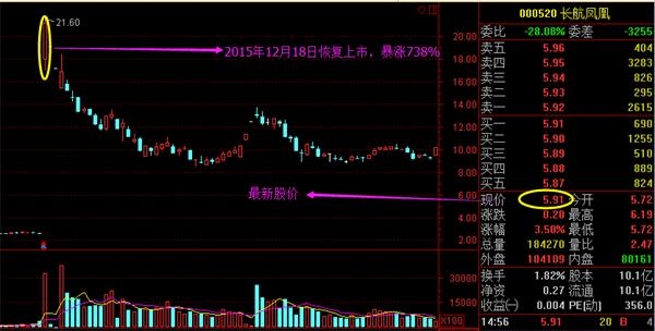 2013年12月27如停牌暂停上市,2015年12月18日恢复上市交易。上市当天长航凤凰股价暴涨738%。不过暴涨过后,是接连跌停和持续回落,收盘价21.2元,盘中最高21.6元。回落至今,最新股价仅为5.91元,自高位下来跌幅超70%。