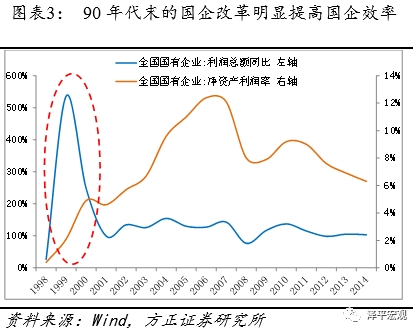 一,混改可有效提升国企绩效。社会资产引入到国企后,将改善资本结构,改进公司治理,明确效率导向,提升国企经营绩效,90年代末的国企改革,通过“抓大放小”,国企效率提升明显,国企利润增速和利润率都明显上升;