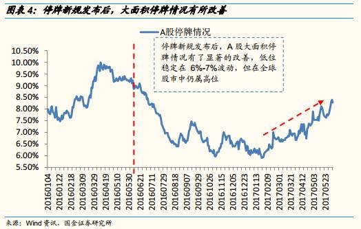 2)2016年5月出台停牌新规后,A股停牌潮有了显著的改善:新的停牌规定是在2016年5月出台的,当时MSCI认为政策实施成效仍需对市场反应进行持续观察。经过一年多的观察,我们发现,停牌新规对A股大面积停牌现象的确有遏制作用,实施3个月后停牌率即稳定在6%-7%,停牌的改善情况明显。