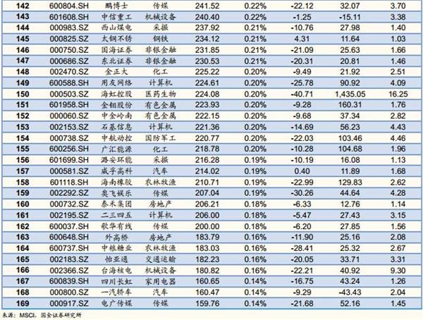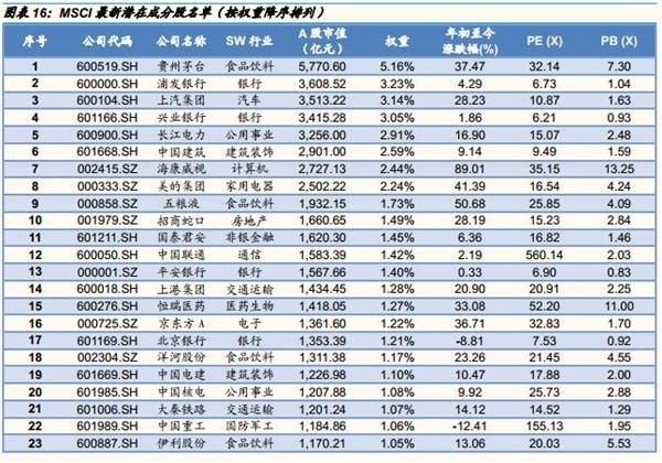 MSCI潜在标的前十大权重股分别是:贵州茅台(5.16%)、浦发银行(3.23%)、上汽集团(3.14%)、兴业银行(3.05%)、长江电力(2.91%)、中国建筑(2.59%)、海康威视(2.44%)、美的集团(2.24%)、五粮液(1.73%)、招商蛇口(1.49%)、国泰君安(1.45%)等。完整169支成分股列表如下。