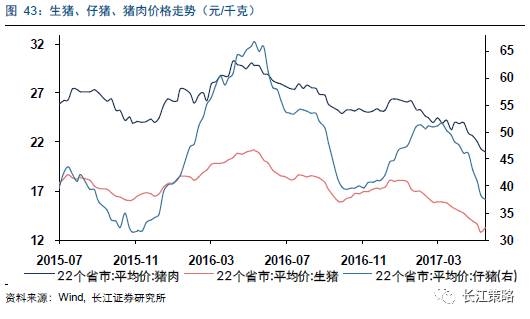 畜类:猪肉价格继续下滑,仔猪价格持续回落,生猪价格出现上调。4月生猪存栏量环比上涨,能繁母猪存栏止跌企稳,后期补栏力度加大,产能逐步恢复,长期看猪价将稳中有降,猪价中枢同比将小幅下移。