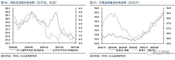 禽类:鸡肉价格下滑,鸡苗价格环比上涨。一季度禽流感对禽类市场的负面冲击逐步被市场消化,近期价格处于低位调整阶段。考虑前期存栏较低的情况,市场上鸡肉供给短期仍紧张,随着禽肉需求逐步回升,鸡肉价格有望逐步企稳。目前市价显著低于历史平均值,仍看好鸡肉价格的长期上涨。鸡肉及鸡苗价格:上周,50个城市白条鸡平均价为21.42元/千克,环比增速-0.70%。主产区肉鸡苗价格达到0.65元/羽,环比增速35.42%。