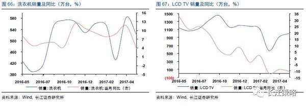家电:空调销量回升再度保持高增长。整体来看,大家电增速仍保持稳定增长趋势。考虑到地产回暖带来的滞后效应,预计家电行业短期内继续维持较高景气度。4月份空调内外销量合计1463万台,同比增速32.34%,增速较上月再度上升。4月份冰箱销量709.80万台,同比增速-2.30%,环比增速-3.59%。洗衣机销量521.20万台,同比增速3.80%,LCDTV销量为1008.30万台,同比增速-10.20%,环比增速9.80%。