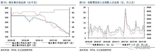 5月传统车销量企稳向上,新能源车景气度回升。5月份汽车、新能源车销量同比增速分别为0.58%、28.6%。空调销量增速回升再度保持高增长。4月空调销量1463万台,同比增长32.34%。上周,维生素价格下滑。电影票房及人次环比回落。上周票房和观影人次环比增速分别为-32.18%和-33.49%。