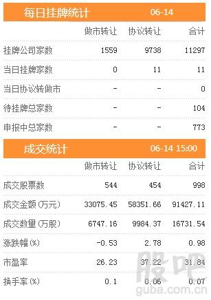 昨日新增挂牌企业11家,挂牌企业总数达到11297家,做市转让1559家,协议转让9738家,待挂牌总家数104只,申报中总家数达到773家。