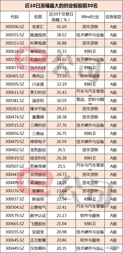 此外,路通视信、科泰电源、寒锐钴业、和晶科技、当升科技、高伟达、川金诺、美力科技与溢多利近10个交易日内涨幅均超过30%,成为创业板的“反弹先锋”。